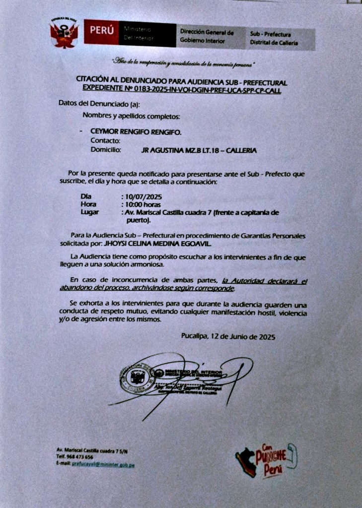 Tras esta serie de entredichos, Ceymor Rengifo, recibió sorpresivamente una notificación vía WhatsApp, informándole que había sido denunciado por Jhoysi Medina ante la Sub – Prefectura Distrital de Callería (Exp. 0183-2025-IN-VOI-DGIN-PREF-UCA-SPP-CP-CALL), donde el subprefecto Jeff Zegarra Reátegui, cita al comunicador para que tenga un careo con la persona a quien cuestiona a través de su plataforma digital.